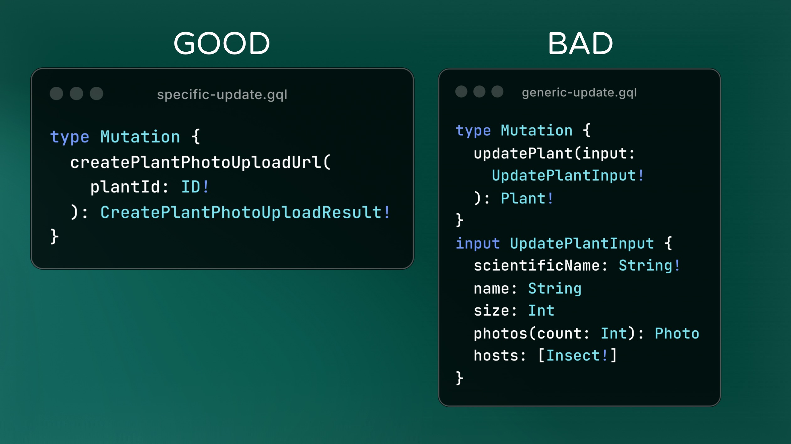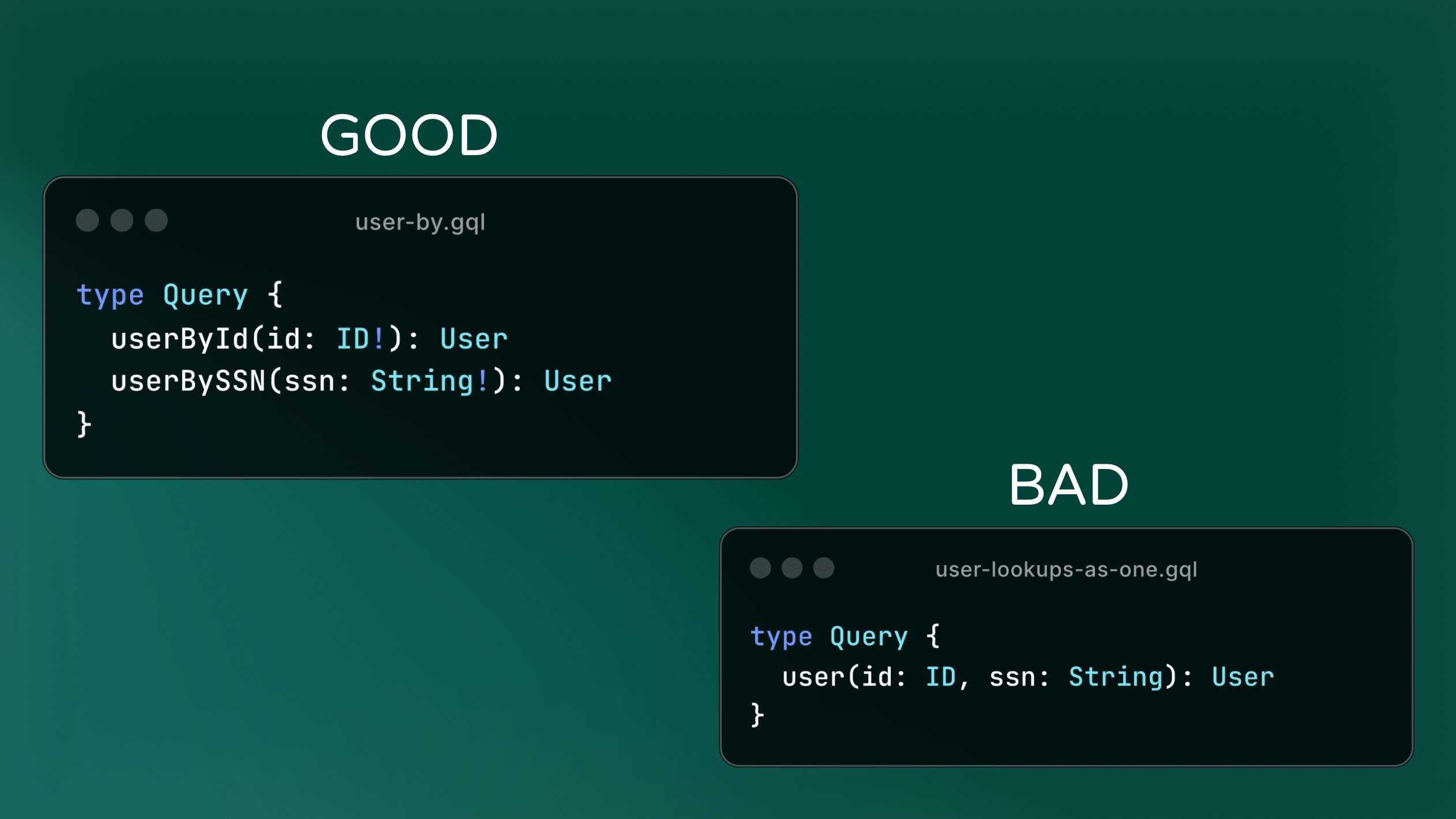 So don’t overload your arguments or an input type with a bunch of optional ways of doing things. By keeping fields more focused, we limit the impact that any one change can have. And if we do need to break things, the blast radius to your API consumers is much smaller.